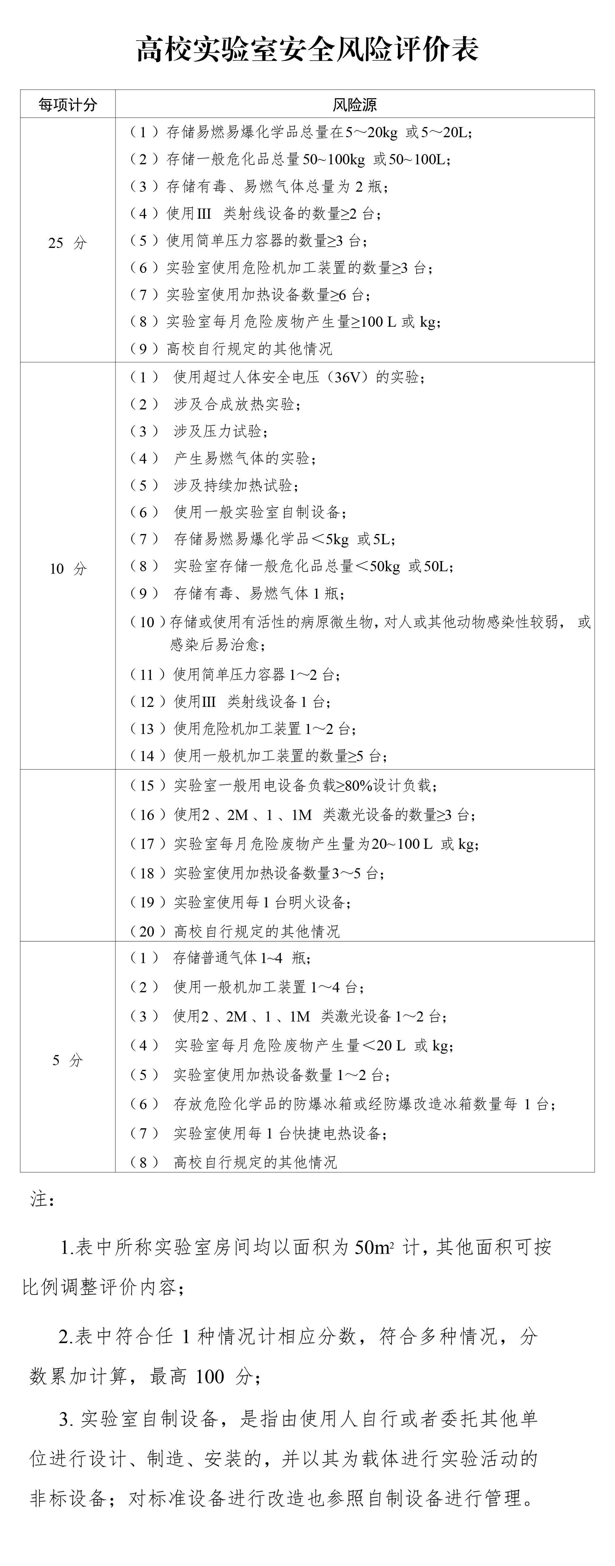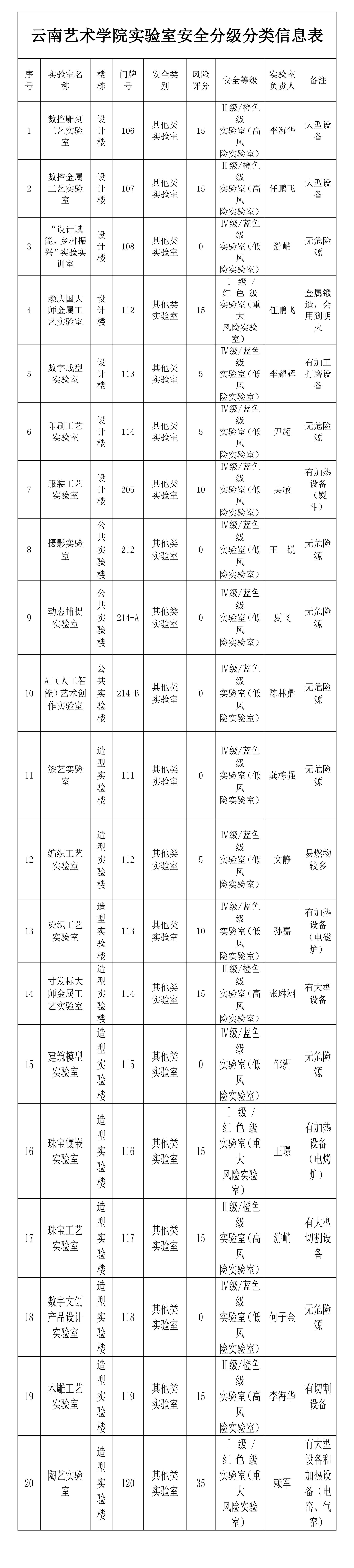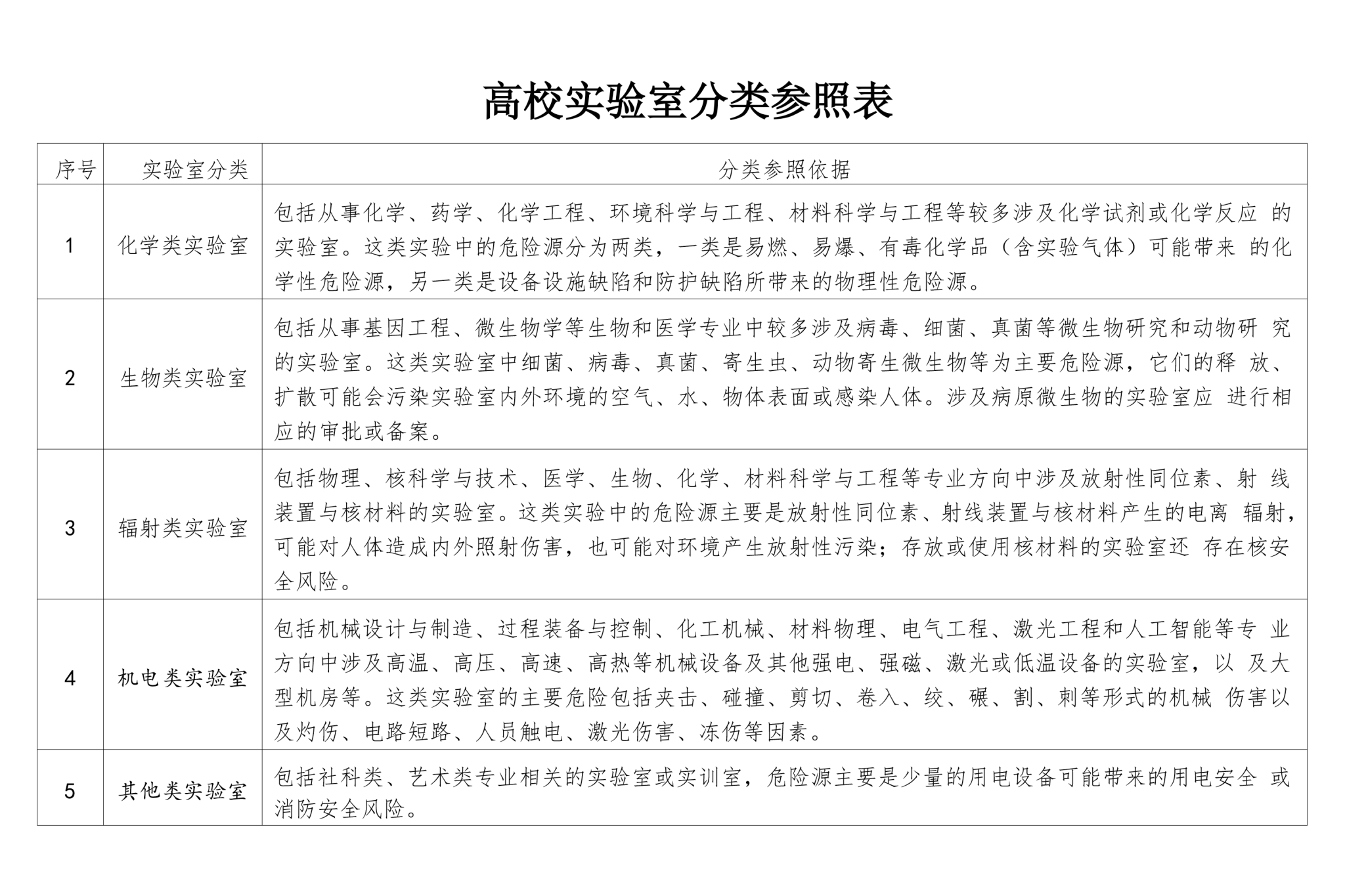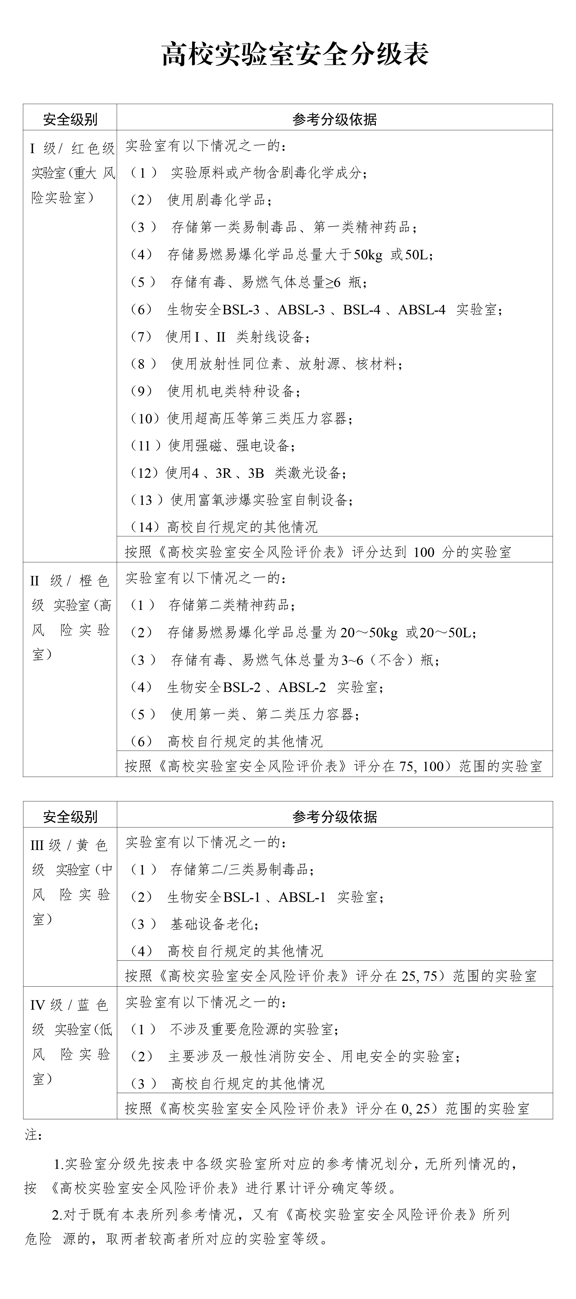 根据教育部印发的《高等学校实验室安全分级分类管理 办法(试行)》(教科信〔2024〕4号)的文件要求,为全面掌握我校实验室安全分级分类的信息,更好地制定符合我校现状的实验室安全分级分类管理办法及实施方案上报教育厅备案,现就报送实验室安全分级分类信息的有关工作通知 如下: