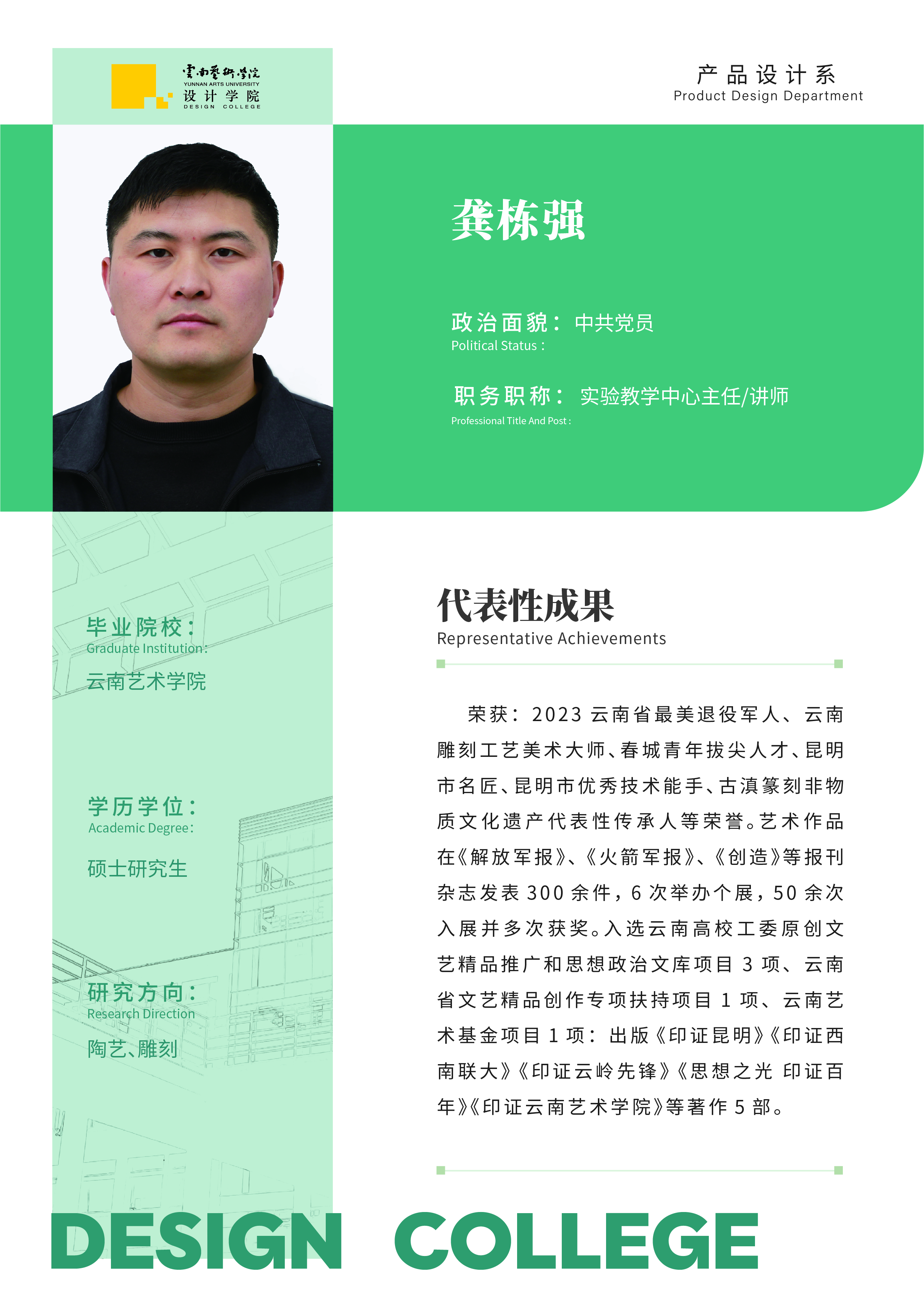 专业现有专任教师24人,教授6人,副教授7人,专任教师高级职称占54.17%;博士8人,硕博占比79%,中青教师占80%。团队中有二级教授1人、省级教学名师2人、云岭教学名师1人、省级优秀教师1人、卓越青年教师1人、享受省政府津贴2人。专业现已建立了我省最大最全的手工艺与数字化教学试验体系,涵盖“金、木、石、土、布”五大工艺门类,目前建设有专业实验室16个、产学研一体化教学实训基地18个、系列教师创意设计工作室14个、产学研平台研发项目300余项,研发成果实现产值近3000万,并荣获各类省部级奖项100余项。