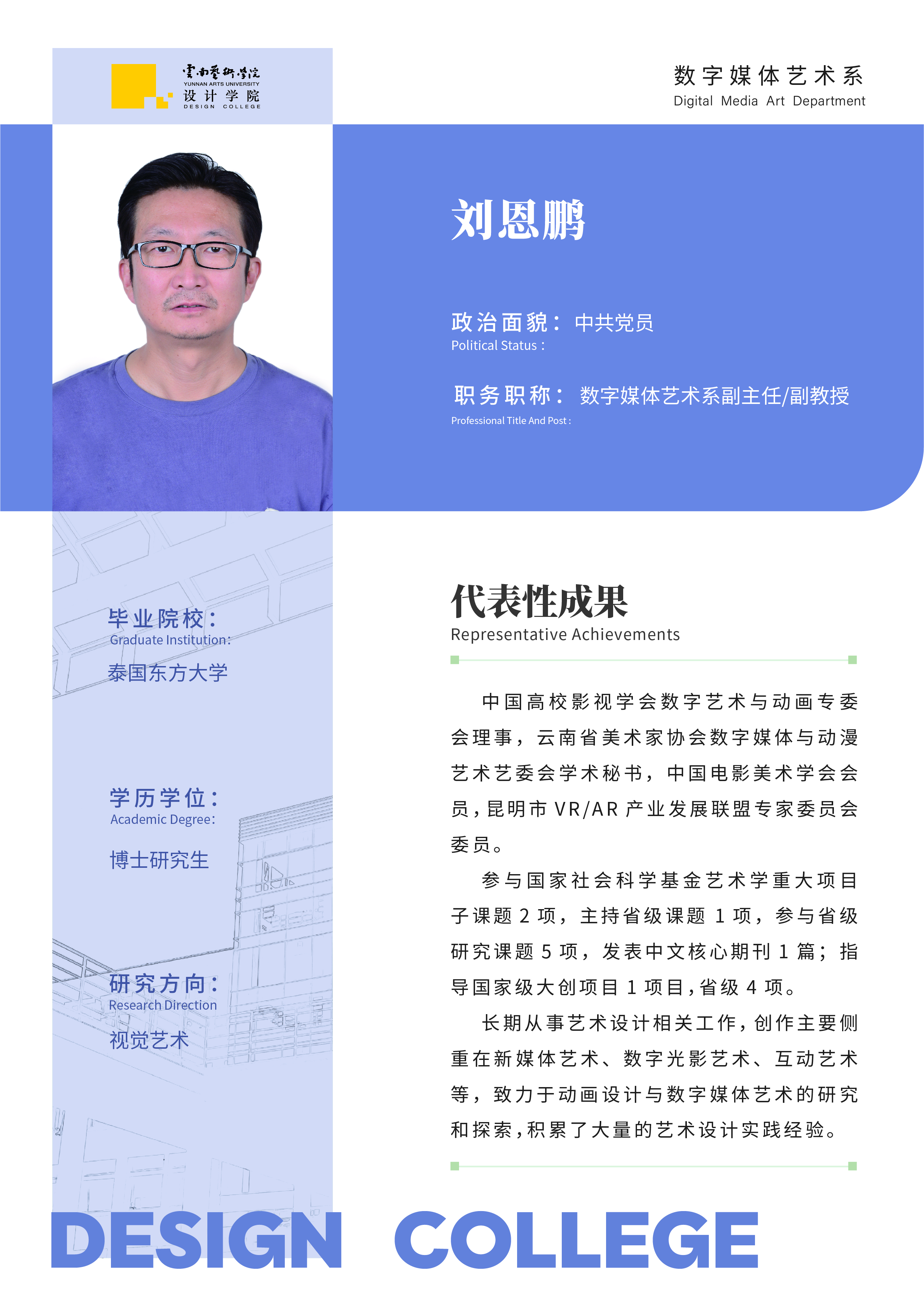 数字媒体艺术专业现有专任教师15人,其中教授(正高)4人,副教授4人。具有博士学历5人。具有教学名师学术头衔的有1人,云南省数字媒体艺术专业指导委员会委员2人。2020年本专业的新增聘请副高以上职称教师6人,均来自国内知名院校,师生比控制在1:16以内。骨干教师获聘国家级省级学会4人并担任重要职位,教师每年参与培训交流20余项,行业经验对教学水平有了较大促进作用。