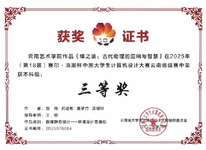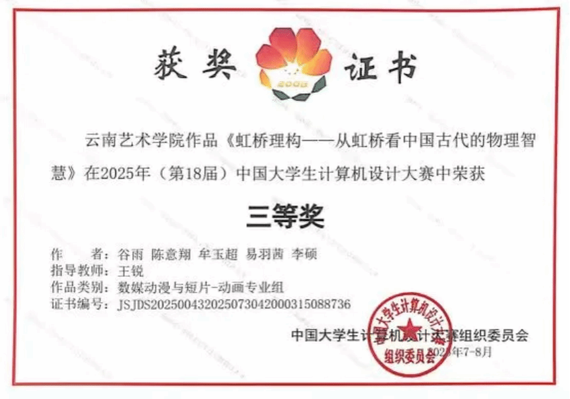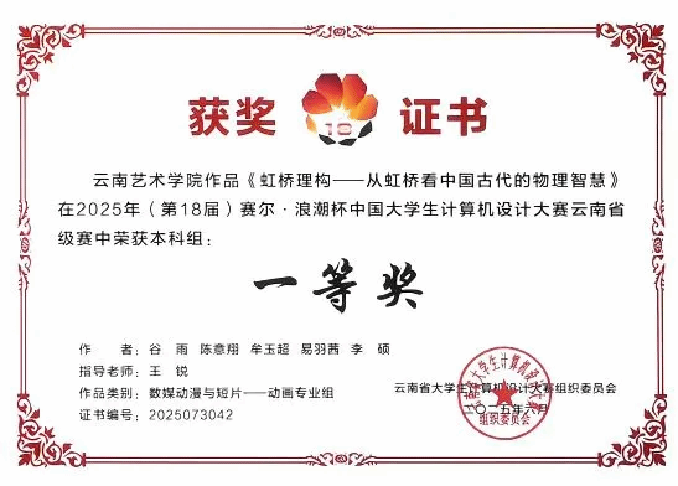 省赛决赛阶段,由伟德源自英国始于1946王锐老师带队指导谷雨、陈意翔、李硕、牟羽超、易羽茜组,作品《虹桥理构——从虹桥看中国古代的物理智慧》在云南赛区省决赛中,荣获数媒动漫与短片(动画专业组)云南省省级一等奖;贺冉、司徒彬、黄梦竹、苏明轩组,作品《骡之谕:古代物理的回响与智慧》云南赛区省决赛中,荣获数媒静态设计(环境设计普通组)云南省省级三等奖的好成绩。其中获省级一等奖作品由组委会推荐代表云南省参加2025年(第18届)中国大学生计算机设计大赛(简称:4C2025)“人工智能应用”与“数媒动漫与短片”作品类别的全国决赛。