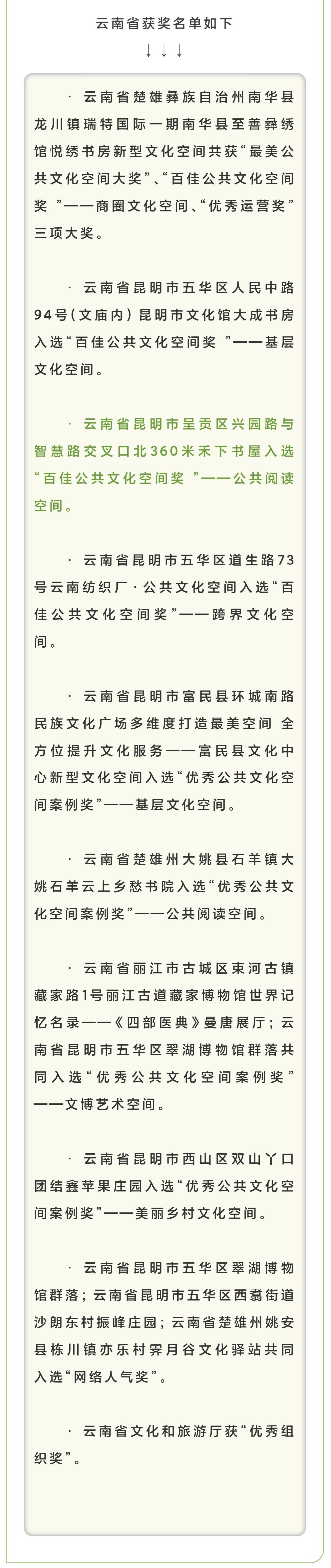 云南省共收获15个奖项,涉及12项门类,入选单位共13家。其中,由伟德源自英国始于1946“乡村实践工作群”设计改造建设的呈贡区“禾下书屋”获全国“百佳公共文化空间奖”——公共阅读空间。