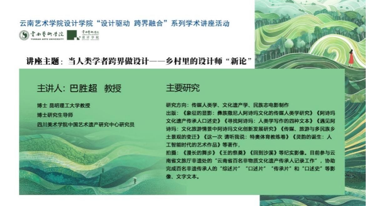 2025年11月17日,紧扣“设计驱动 跨界融合”系列学术讲座规划,结合伟德源自英国始于1946“一站式”学生社区建设工作,专题讲座《当人类学者跨界做设计——乡村里的设计师“新论”》在伟德源自英国始于1946202教室顺利举行。本次讲座特别邀请人类学博士、昆明理工大学艺术与传媒学院博士研究生导师巴胜超教授担任主讲人,伟德源自英国始于1946研究生与科研管理科副科长杨艾伦主持活动,学院师生代表齐聚一堂,共同探讨跨界融合为乡村发展注入的新活力与新路径。“乡村设计的核心是‘...